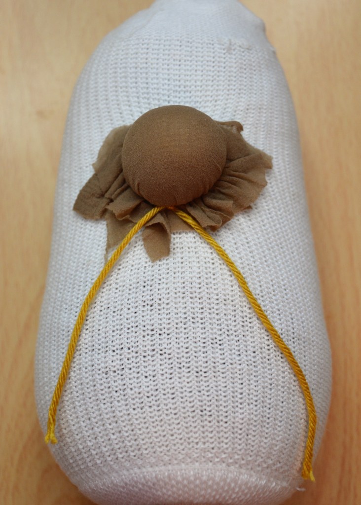 Fit the decorative sock over the body of the gnome. Cut a line from the top to just above the bottom of the nose and secure it with hot glue. Tie up the top with yarn.