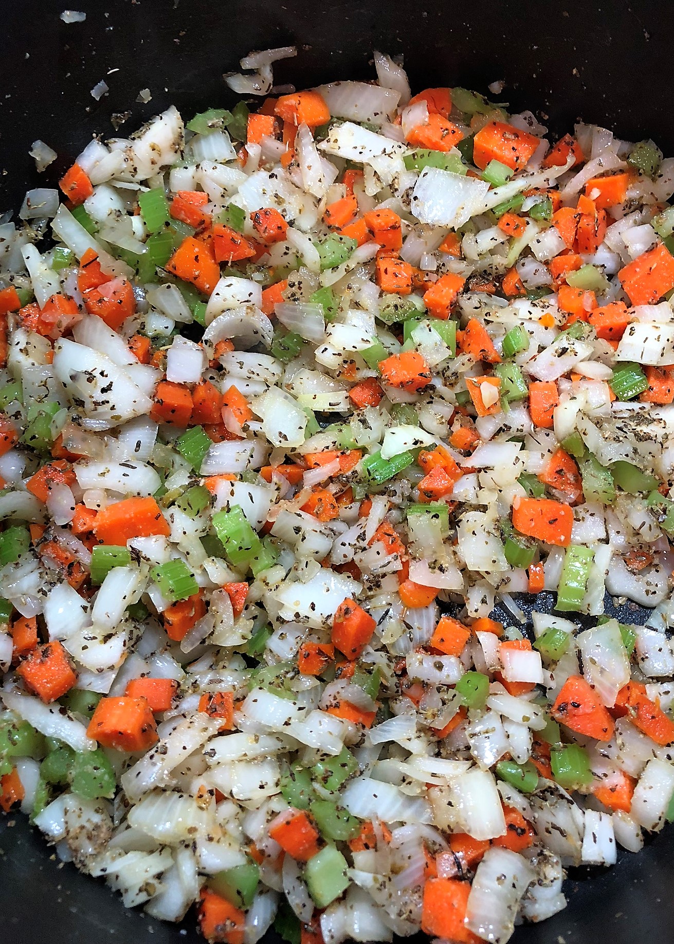 Start by sauteing the carrots, celery, and onion in olive oil over medium high heat.