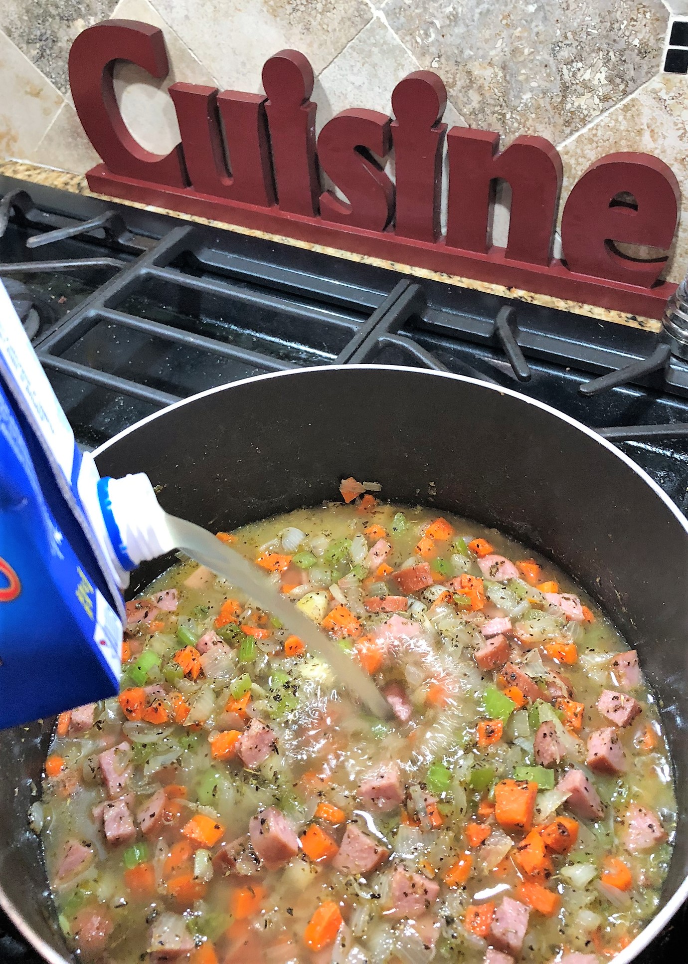 Pour in all 96 ounces of the Chicken Broth and bring to a boil.