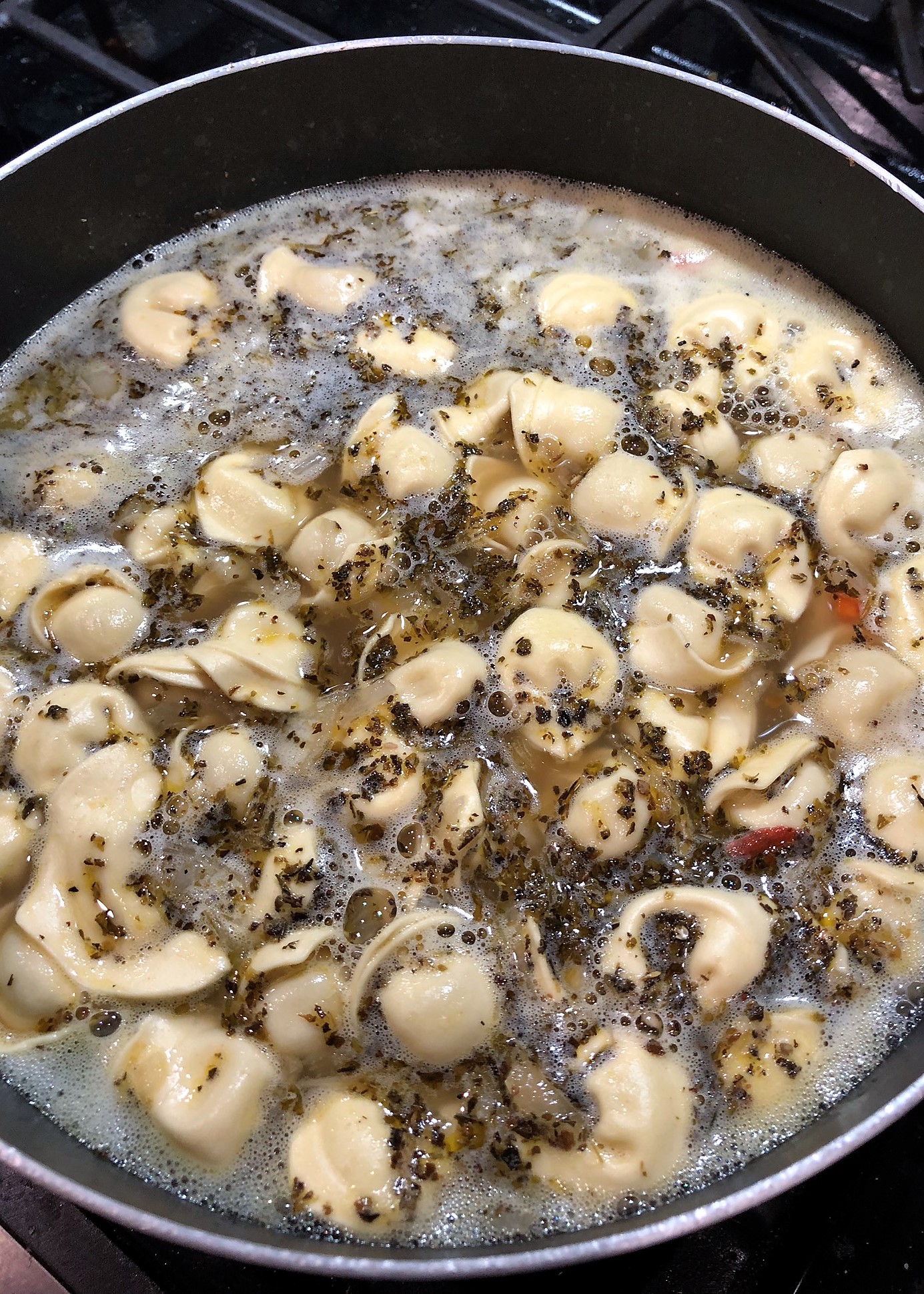 Once the broth is boiling, add the tortellini and cook according to the directions on the tortellini label. It’s usually about seven minutes.