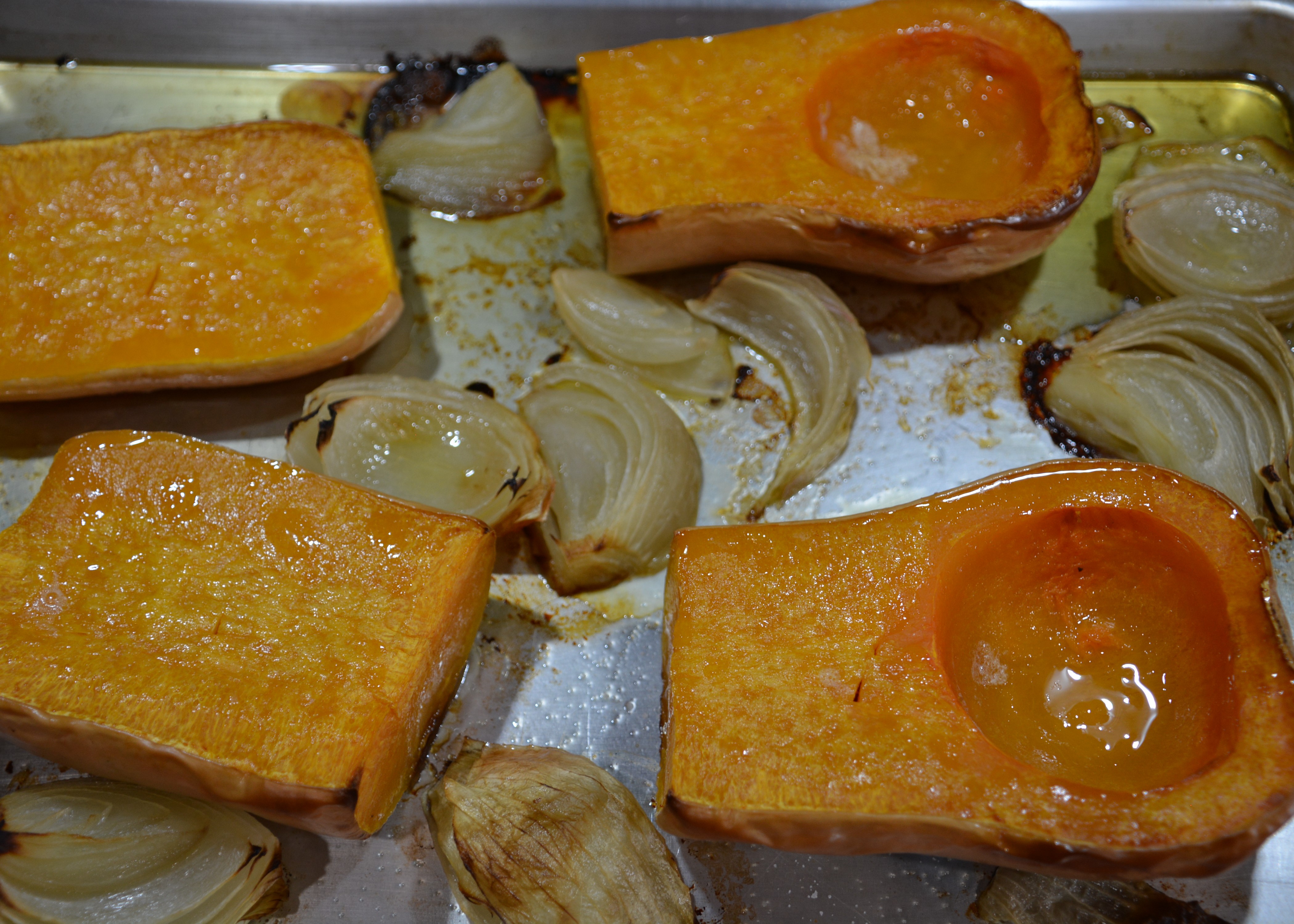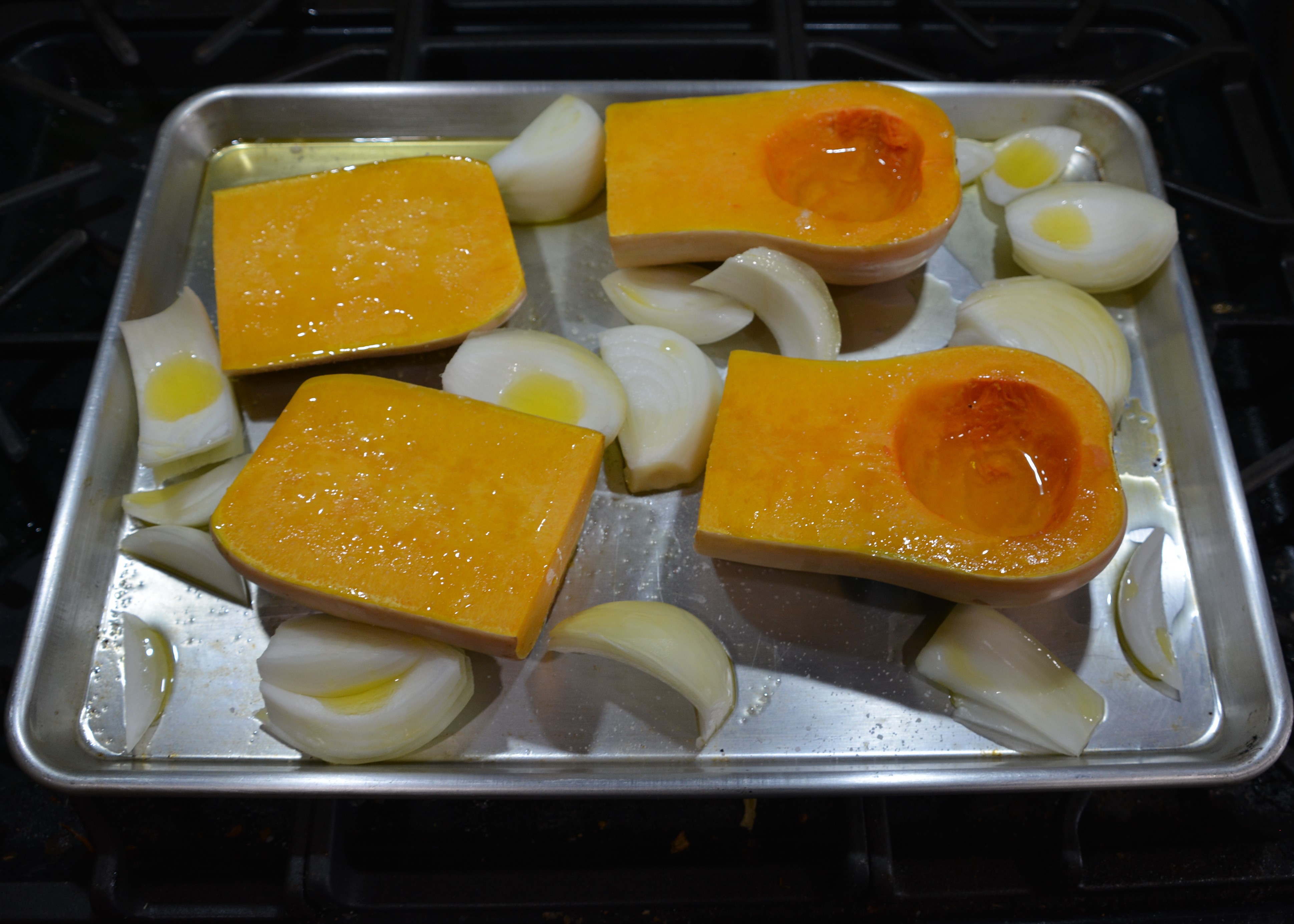 Start by cutting the butternut squash in half or if you really want to be special, take the skin off and then cut it into cubes for roasting. It’s more work that way but it cooks faster. Also, quarter the onion and place that and the squash on a sheet pan. Drizzle some olive oil over everything and pop in the sauna set at 400 degrees.