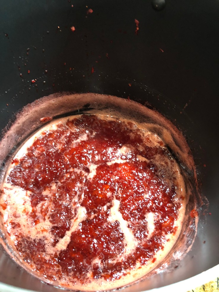 Okay so I’ve got my fruit, my sugar, my pectin, and my lemon juice cooking away.
