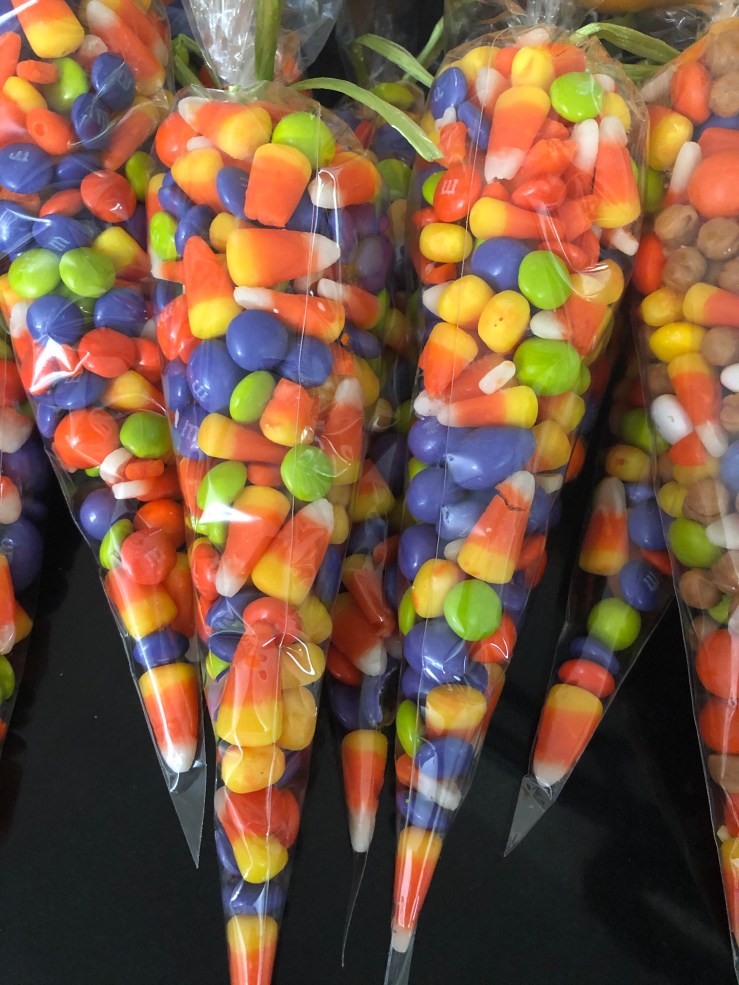 If you are looking for an inexpensive but fun Halloween treat for teachers, co-workers, family or friends – this is for you. I made ten of these candy cones for $20! I bought the cone shaped bags on Amazon and the candy corn and M&Ms from Walgreens. Super easy and a sweet surprise for some wonderful people! Happy Halloween!
